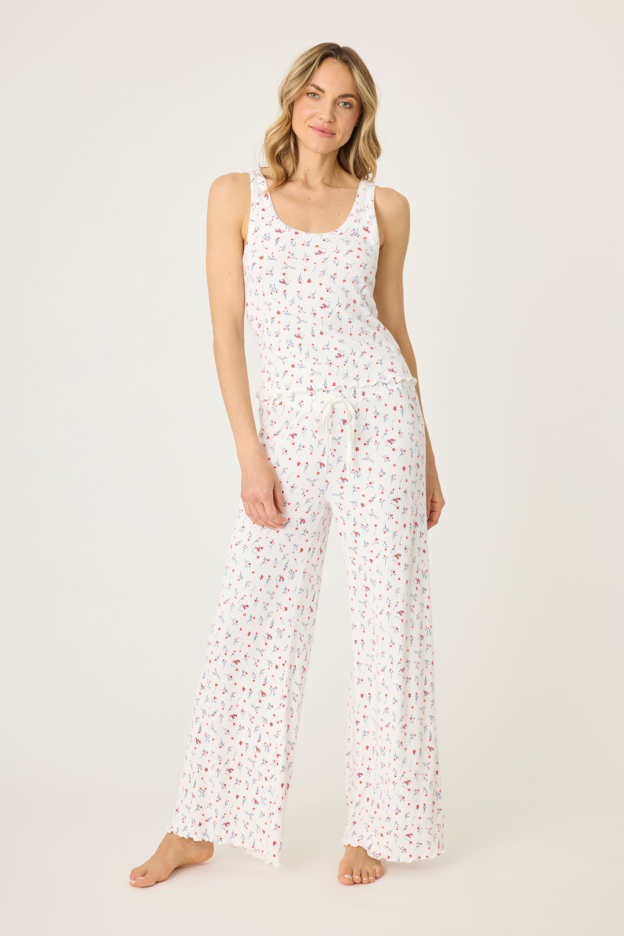 DESCRIPTION: Women’s brushed ribbed cami in ivory with a rose print, scoop neckline, and lettuce-edge trim at the hem.