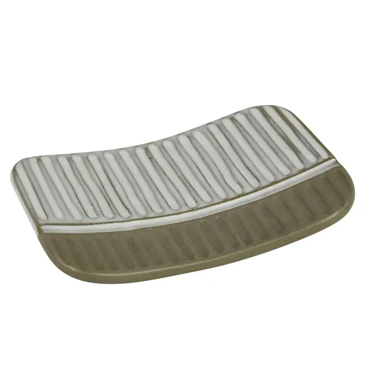 Natural clay is paired with a white glaze over a linear patterned ceramic to create a casual yet classy soap dish.