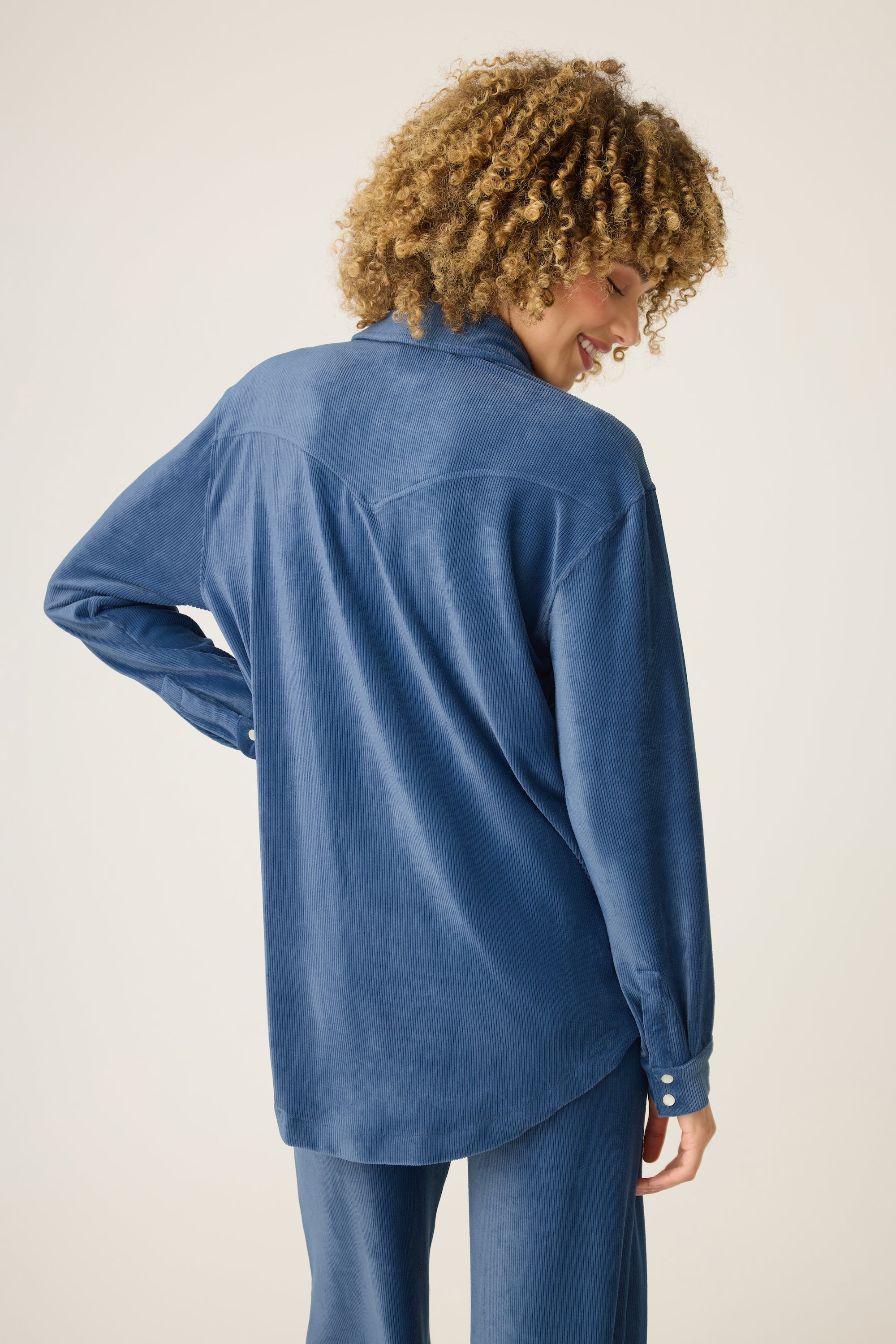 DESCRIPTION:  Women’s velour button-up long-sleeve shirt in blue. Features chest pockets, a curved hem, and relaxed fit with soft texture and subtle sheen.