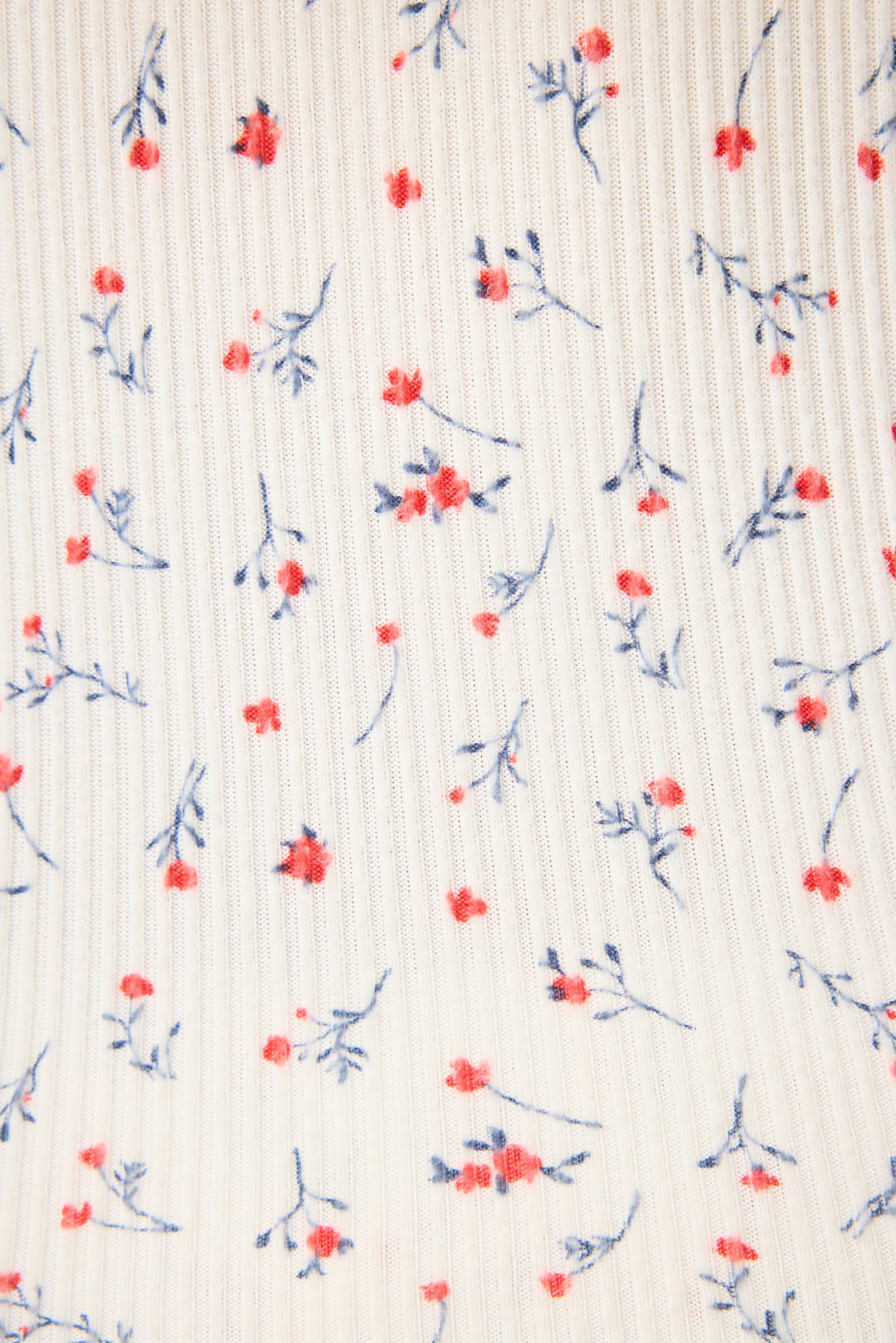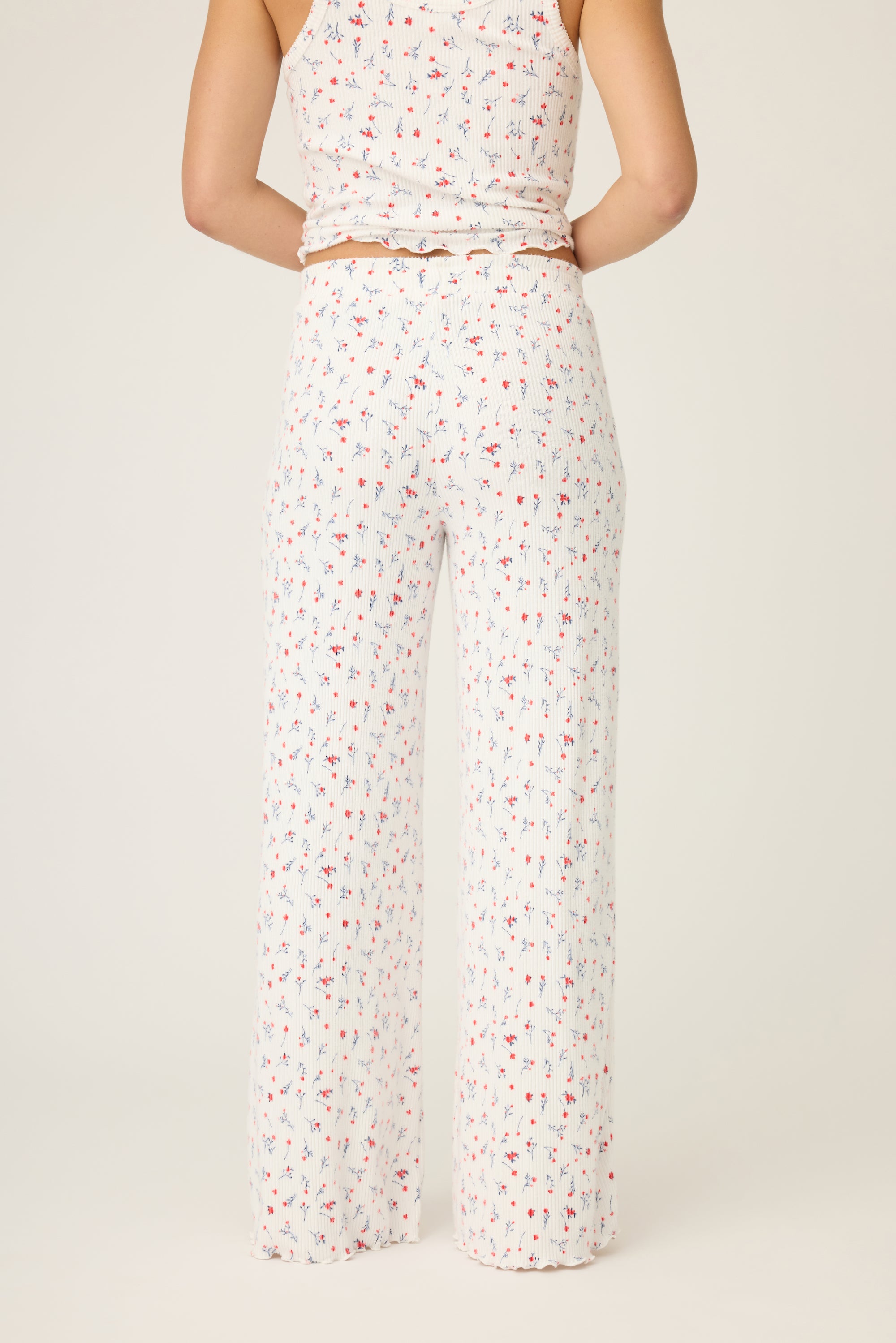 DESCRIPTION:  Women’s brushed ribbed wide-leg pant in ivory with a rose print, drawstring waistband, and lettuce-edge trim.