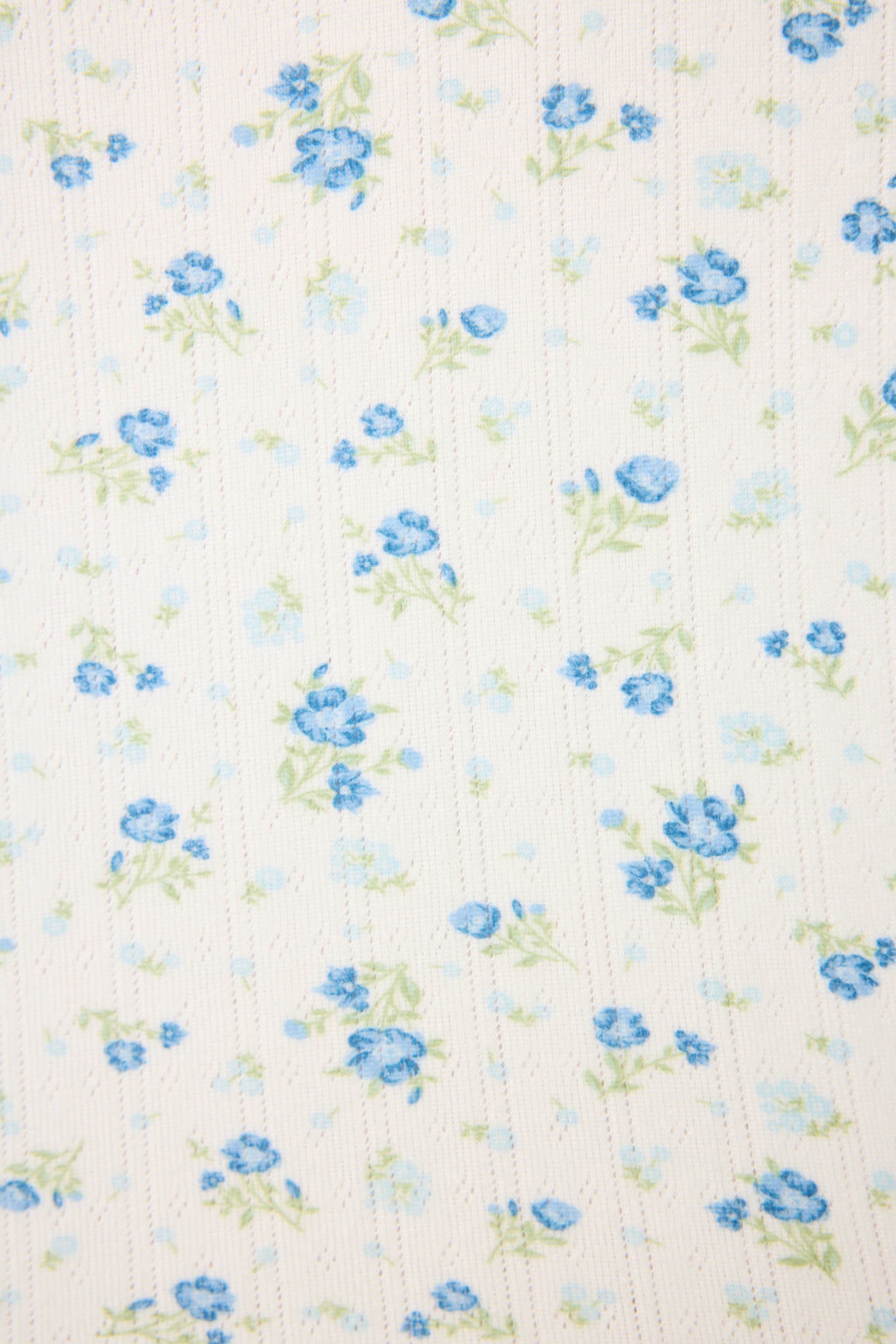 DESCRIPTION: Women’s long sleeve top in double-brushed pointelle featuring a blue floral print, scoop neckline, button-down front, and scalloped trim.