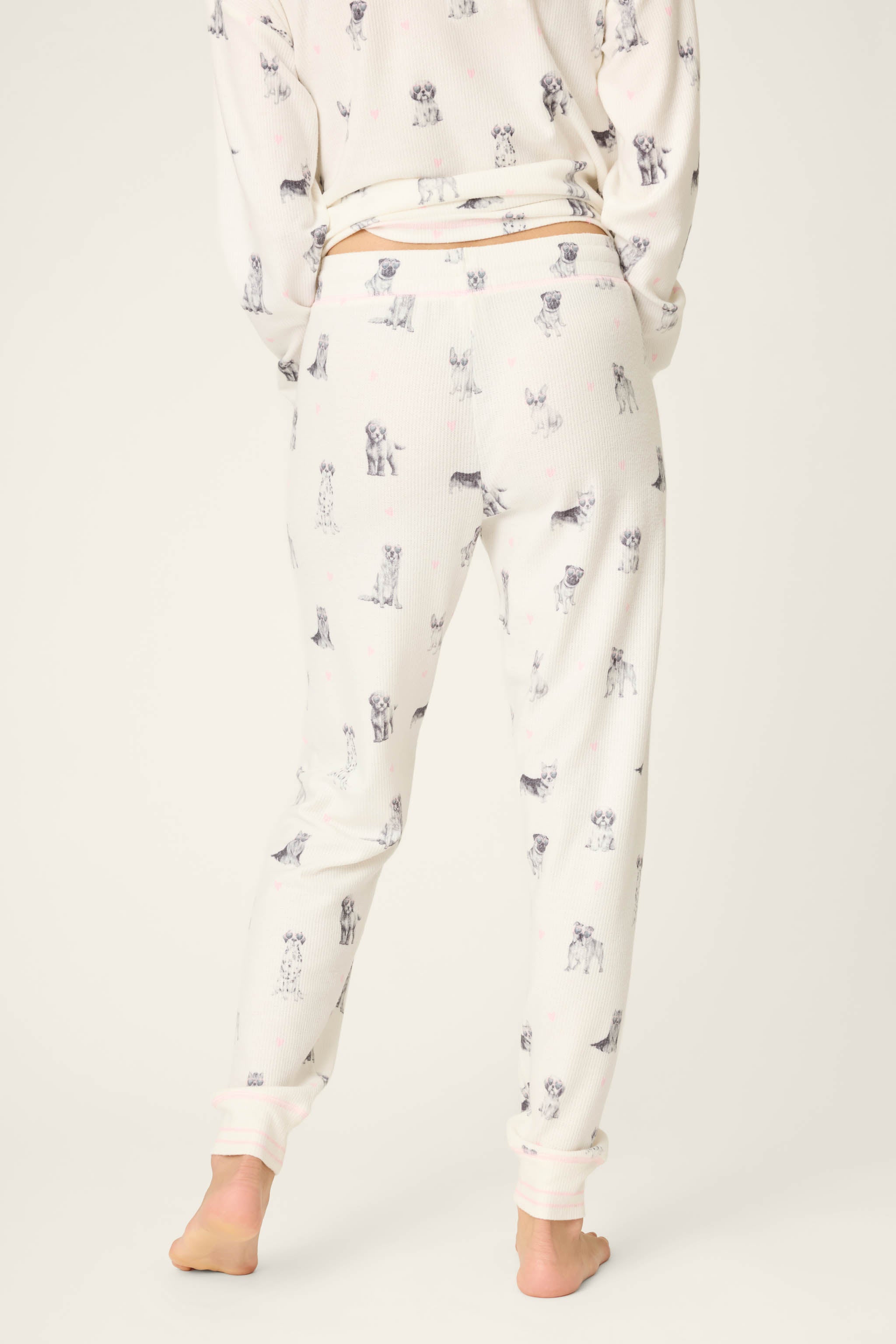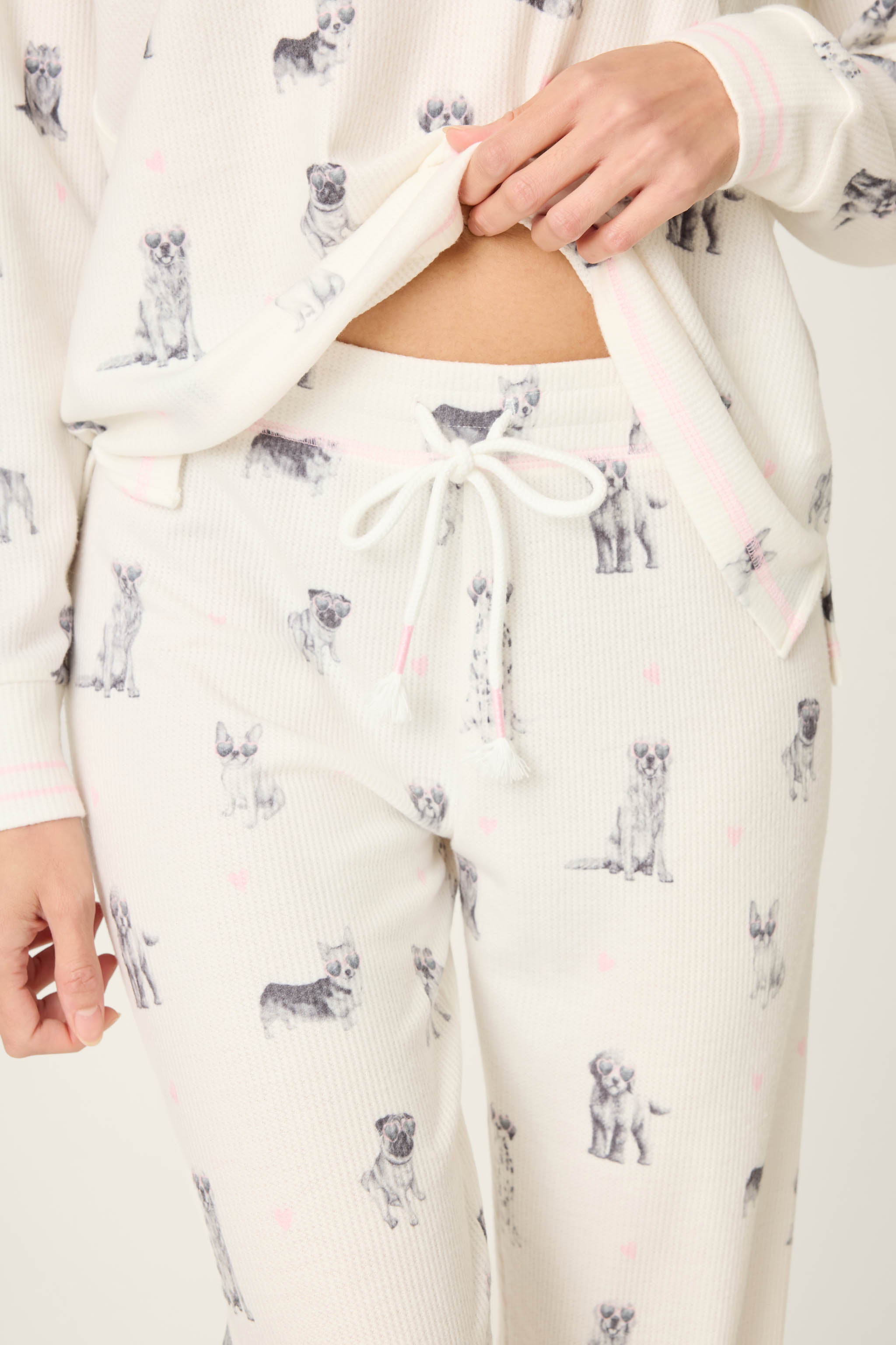 DESCRIPTION: Women’s ivory lounge pants in baby peachy waffle featuring dog print fabric, drawstring waist, side pockets, and pink contrast trim.