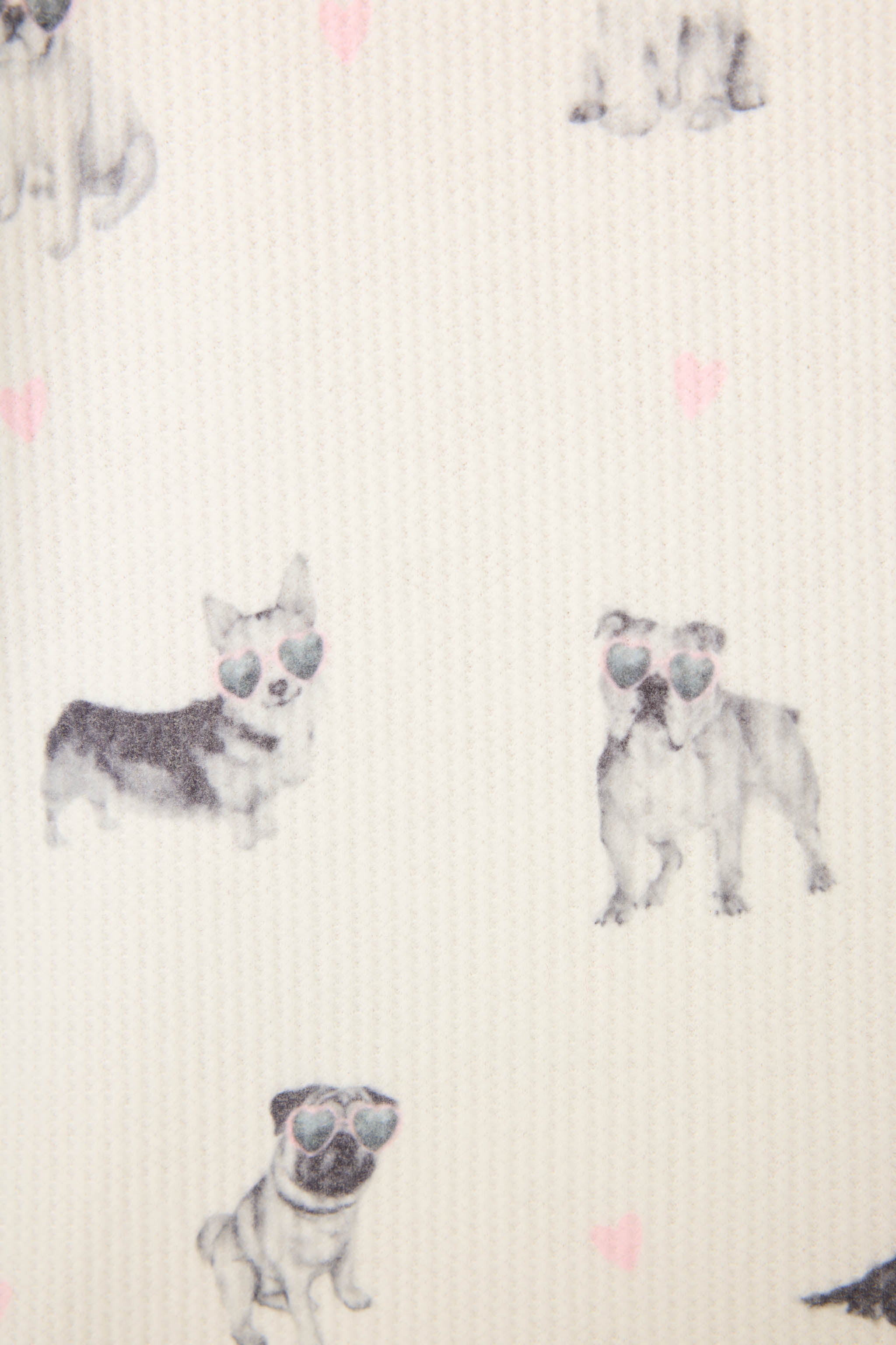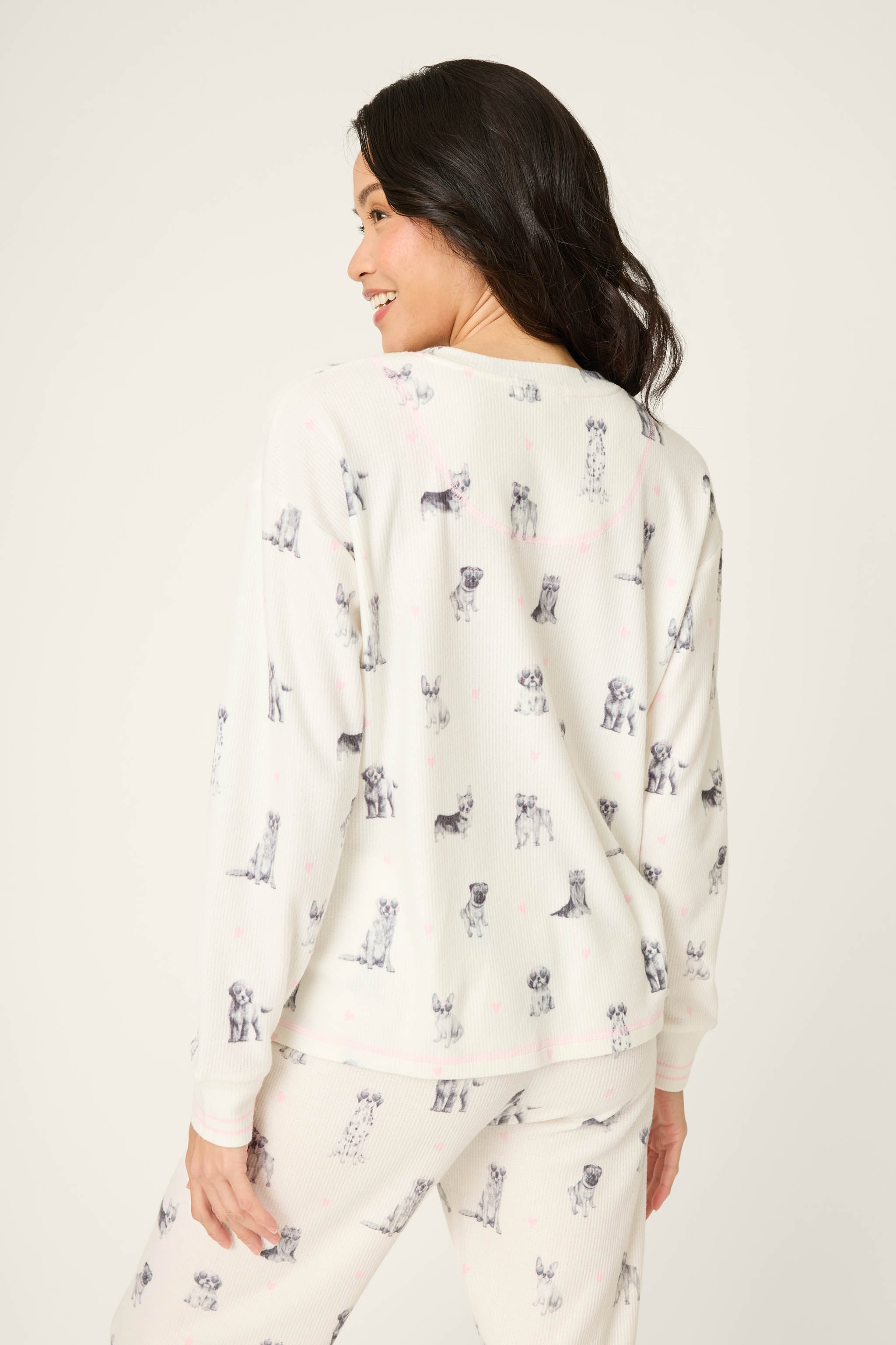 DESCRIPTION: Women’s long sleeve Henley top in baby peachy waffle featuring dog print fabric, button neckline, and pink contrast trim.