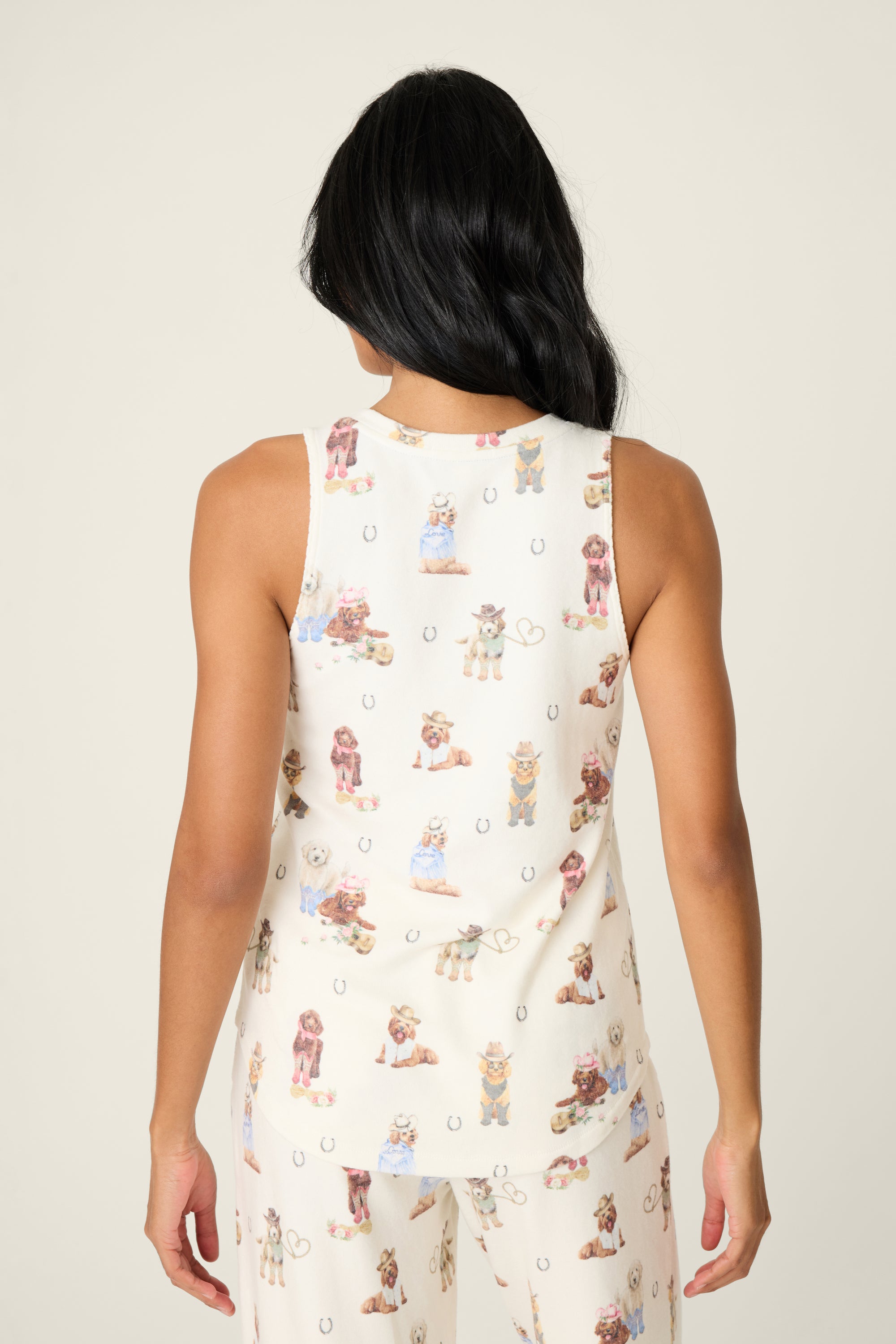 DESCRIPTION: Women’s ivory thermal PJ tank with a curved hem, scalloped trim at the arms, and western dog pri